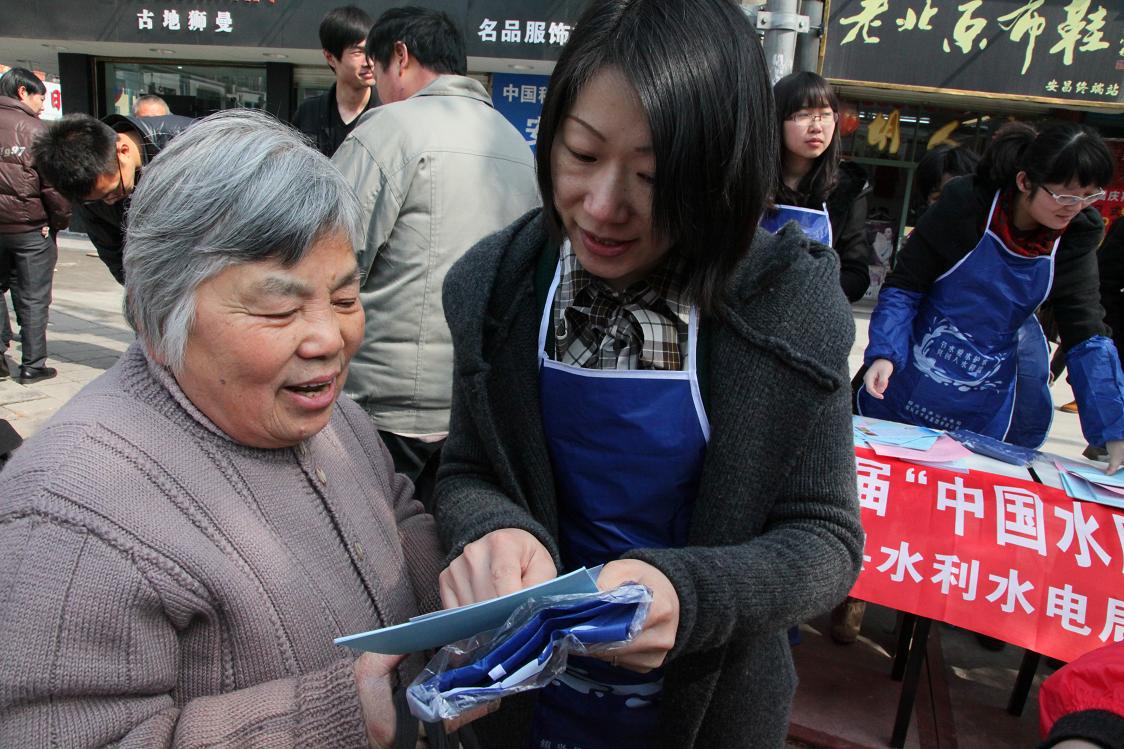 圖為工作人員向過往的居民宣傳節(jié)水、護水知識