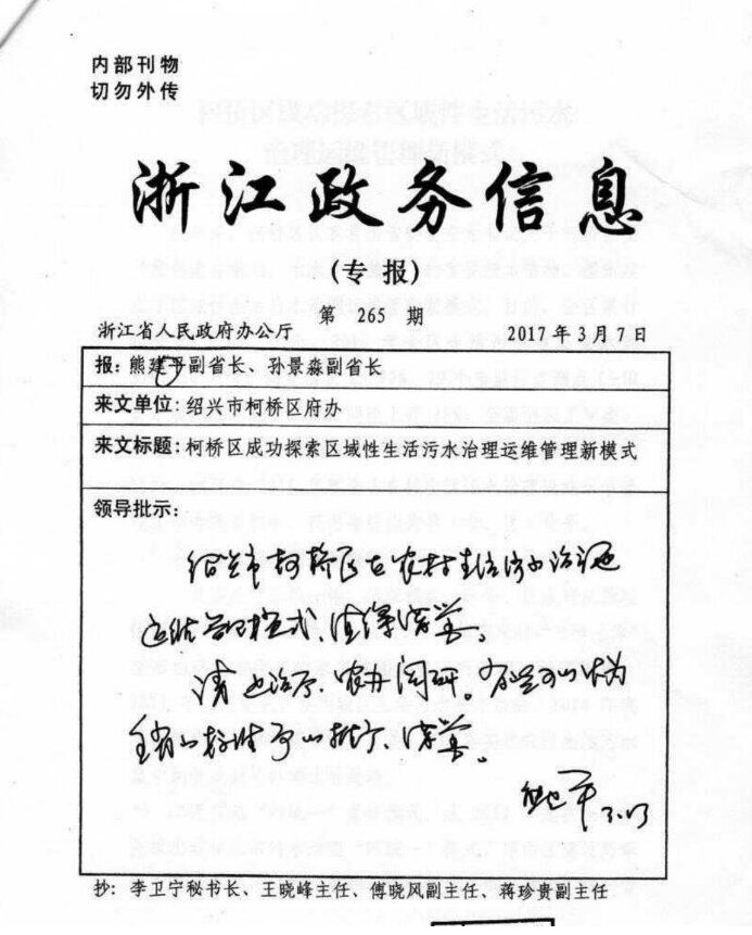 3月7日,浙江省副省長熊建平對《柯橋區(qū)成功探索區(qū)域性生活污水治理運維管理新模式》進(jìn)行批示,認(rèn)為柯橋區(qū)在城鄉(xiāng)生活污水治理運維管理模式值得借鑒,部分經(jīng)驗可以作為全省的標(biāo)準(zhǔn)予以推廣、借鑒。