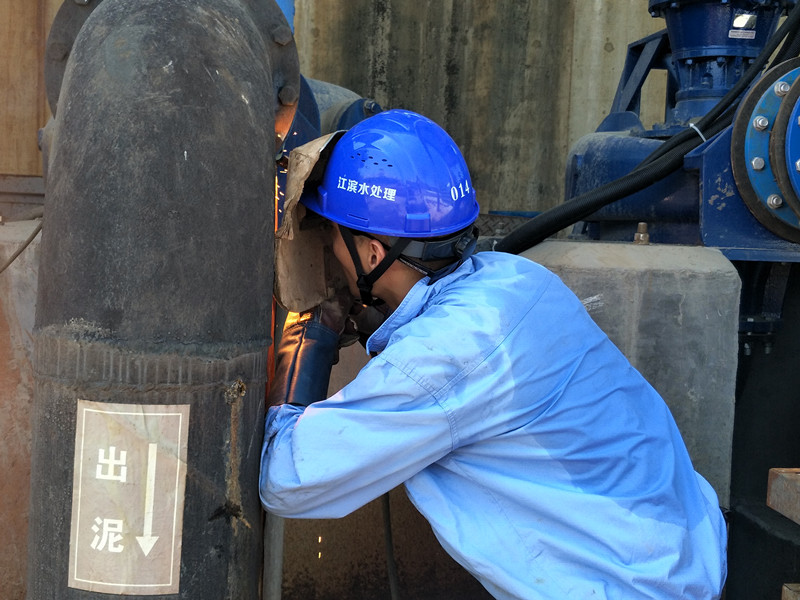 江濱水處理公司設(shè)備部作業(yè)人員正對(duì)排泥管道進(jìn)行搶修焊接作業(yè),焊接時(shí)火花四濺,溫度可以達(dá)到140℃左右。