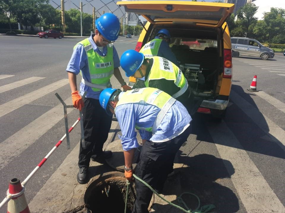 為了保證雷暴天氣不對(duì)路面造成影響,排水公司養(yǎng)護(hù)班同志們對(duì)管道一一檢測(cè)。