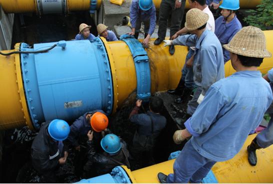 當時,工作人員正在現(xiàn)場巡視,實然發(fā)現(xiàn)市排DN800管道流量計后硬性伸縮節(jié)滲漏噴水,于是立即按照報告制度進行匯報,該公司立即啟動應(yīng)急預(yù)案。搶修分兩路展開,一隊人員用應(yīng)急水泵,將滲漏的污水打入生產(chǎn)系統(tǒng)中;另一隊人員對滲漏點進行檢查,確定是因硬性伸縮節(jié)的兩顆螺絲膨脹后崩斷造成爆管。在通知排水公司對進廠流量進行控制的同時,現(xiàn)場搶修指揮人員立即組織維修人員對硬性伸縮節(jié)進行更換。維修人員在采取相關(guān)安全措施后,冒著不斷噴出的污水,立刻進行拆裝螺栓作業(yè)。隨著水流一點點變小,漏點最終被徹底控制。