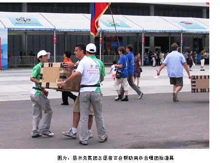 檢票口通道處突然出現(xiàn)個(gè)頭頂大箱的外國(guó)人,看他很吃力的樣子,隊(duì)員主動(dòng)向前提供幫助,經(jīng)過一番的交流,得知該團(tuán)隊(duì)是來自南非的合唱團(tuán),搬大箱子的是該團(tuán)的指揮,里面裝著的是南非民族樂器打鼓,是今天晚上表演的道具,隊(duì)員們將沉甸甸的大箱打鼓搬運(yùn)到了舞臺(tái)幕后。