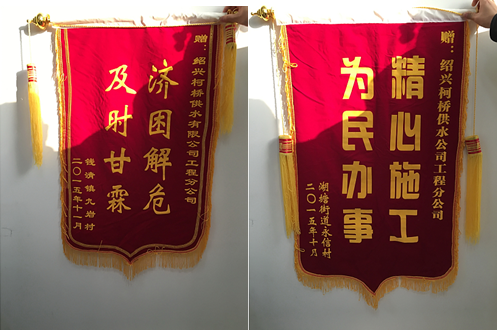 12月29日下午,公司相繼收到湖塘街道永信村和錢清九巖村村委送來的“濟(jì)困解危,及時(shí)甘霖”和“精心施工,為民辦事”兩面錦旗,對(duì)工程分公司工作人員辛勤勞動(dòng)、甘于奉獻(xiàn)的工作精神表示贊賞和感謝。